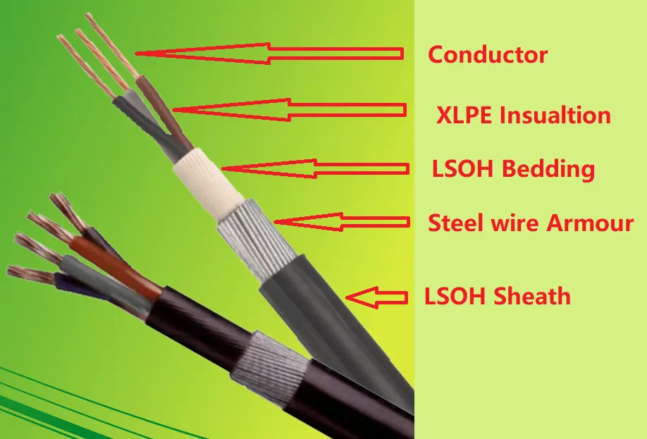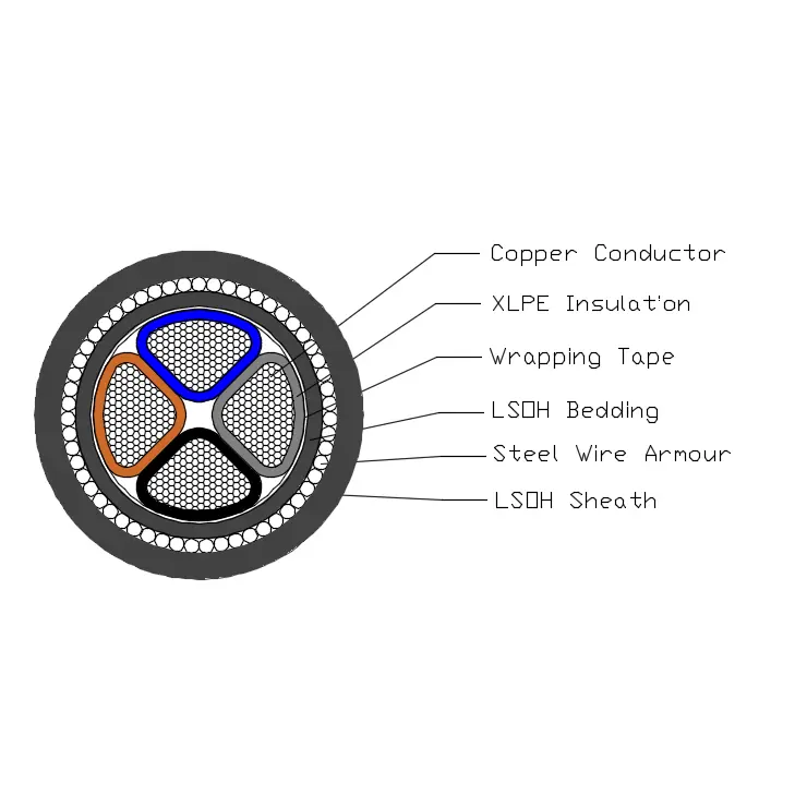 BS 6724 Power Cable T1R kobrezko eroale batek, XLPE isolamenduak, PVC oheak, Steel-weirs armadurak eta LSOH zorroak osatzen dute.
