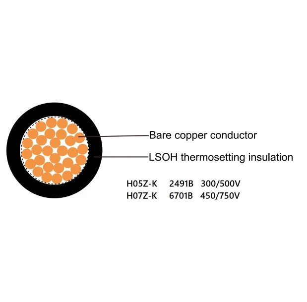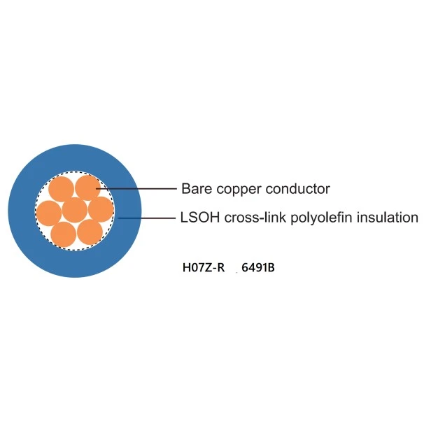 LSZH Nukleo bakarreko kable isolatua, T1R kobrezko eroale batek eta LSOH gurutzadura-loturako poliolefina (LSOH termoegonkorra ere deitzen zaio) isolamenduz osatua.